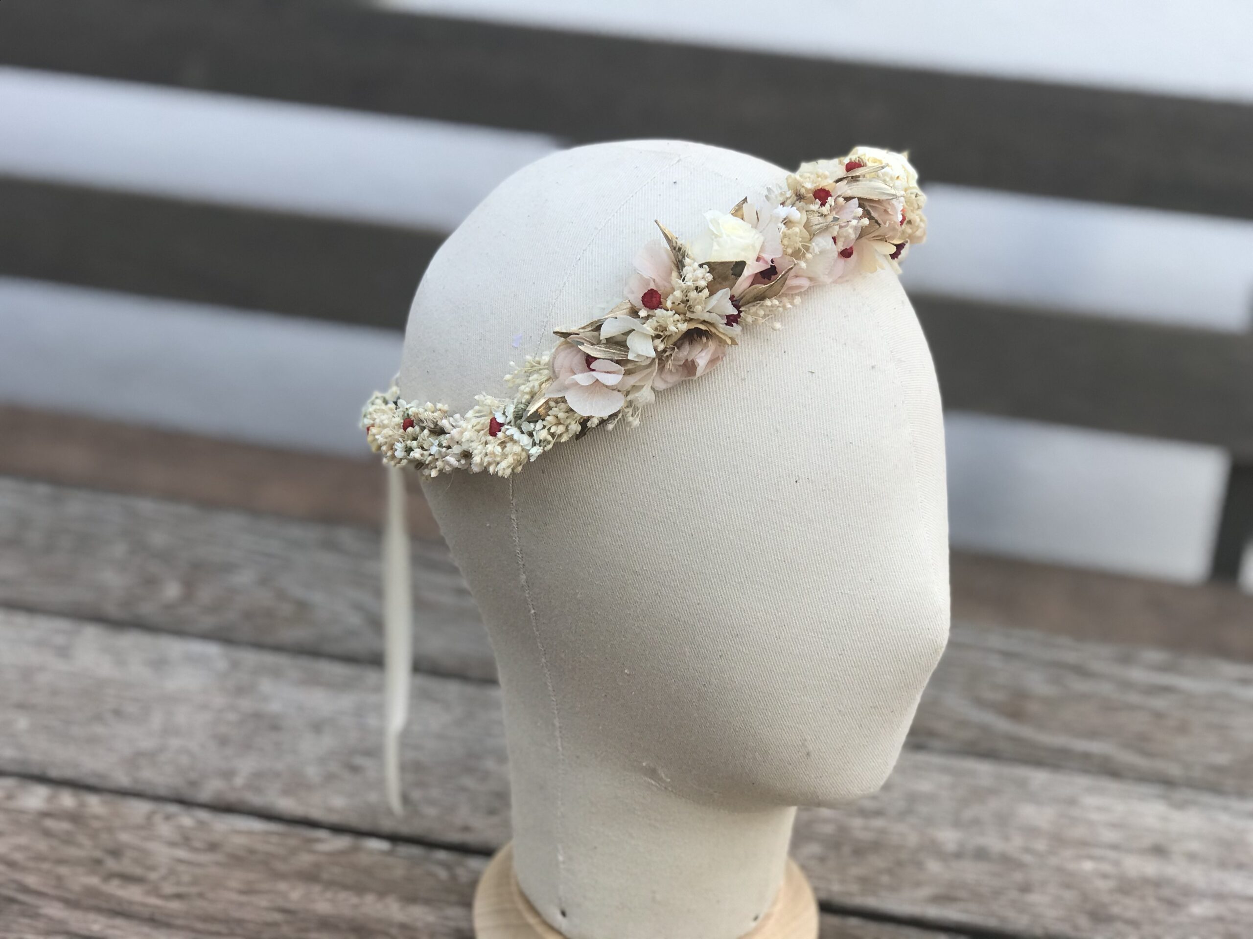 Corona de rosas mini & flor silvestre ajustable con lazo. Tonos crudos, nude, dorado y mini toques rojos