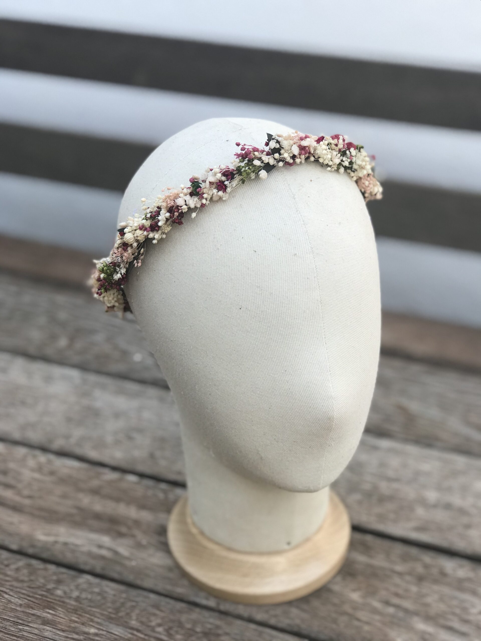 Corona de flor silvestre preservada multicolor. Tonos crudos, toques verdes y frambuesas