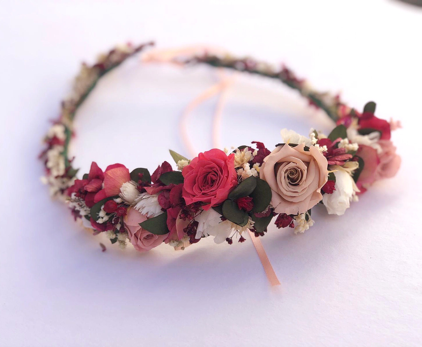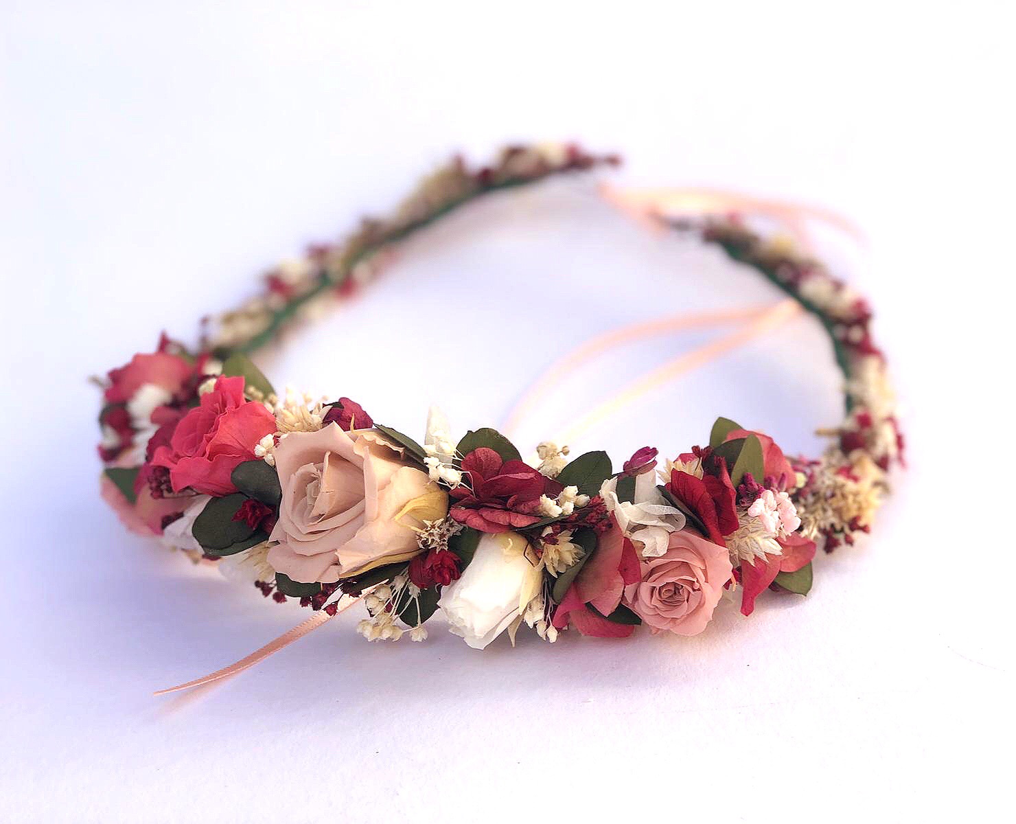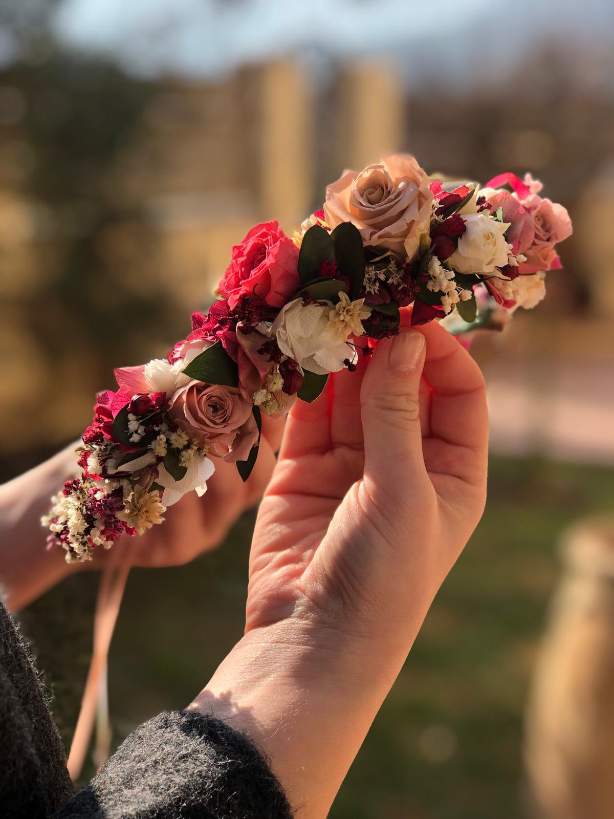 La corona JULIA es una pieza única y muy especial creada con mucho mimo, flores silvestres preservadas, rosas mini preservadas, hojitas de Eucalipto y Hortensia en una gama de tonos frambuesa, blanco, nude y verde tan favorecedora que encaja con la mayoría de tonos de piel y de cabello. Trabajada durante horas en mi taller en la montaña y inspirada en los tonos alegres y naturales de la primavera.