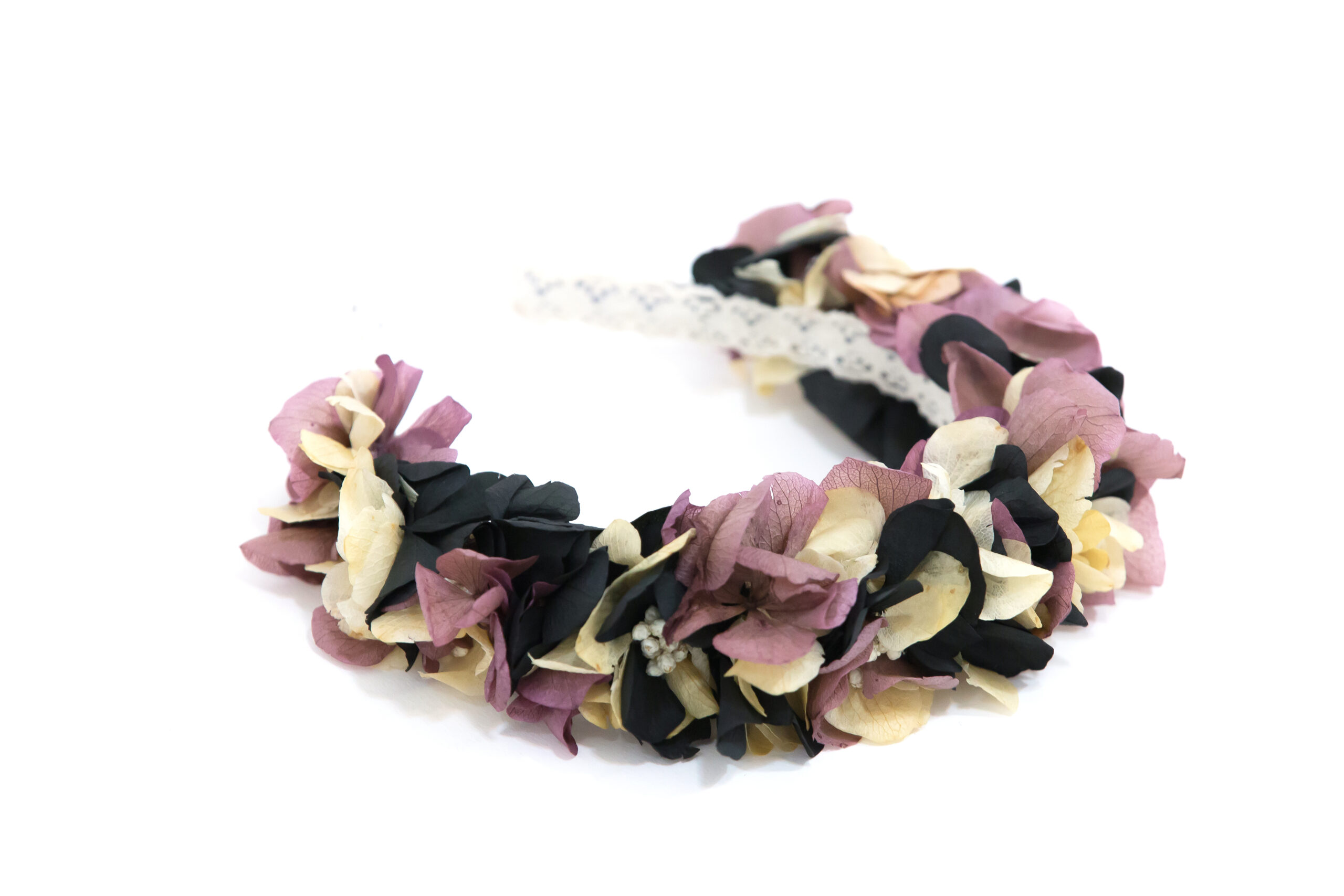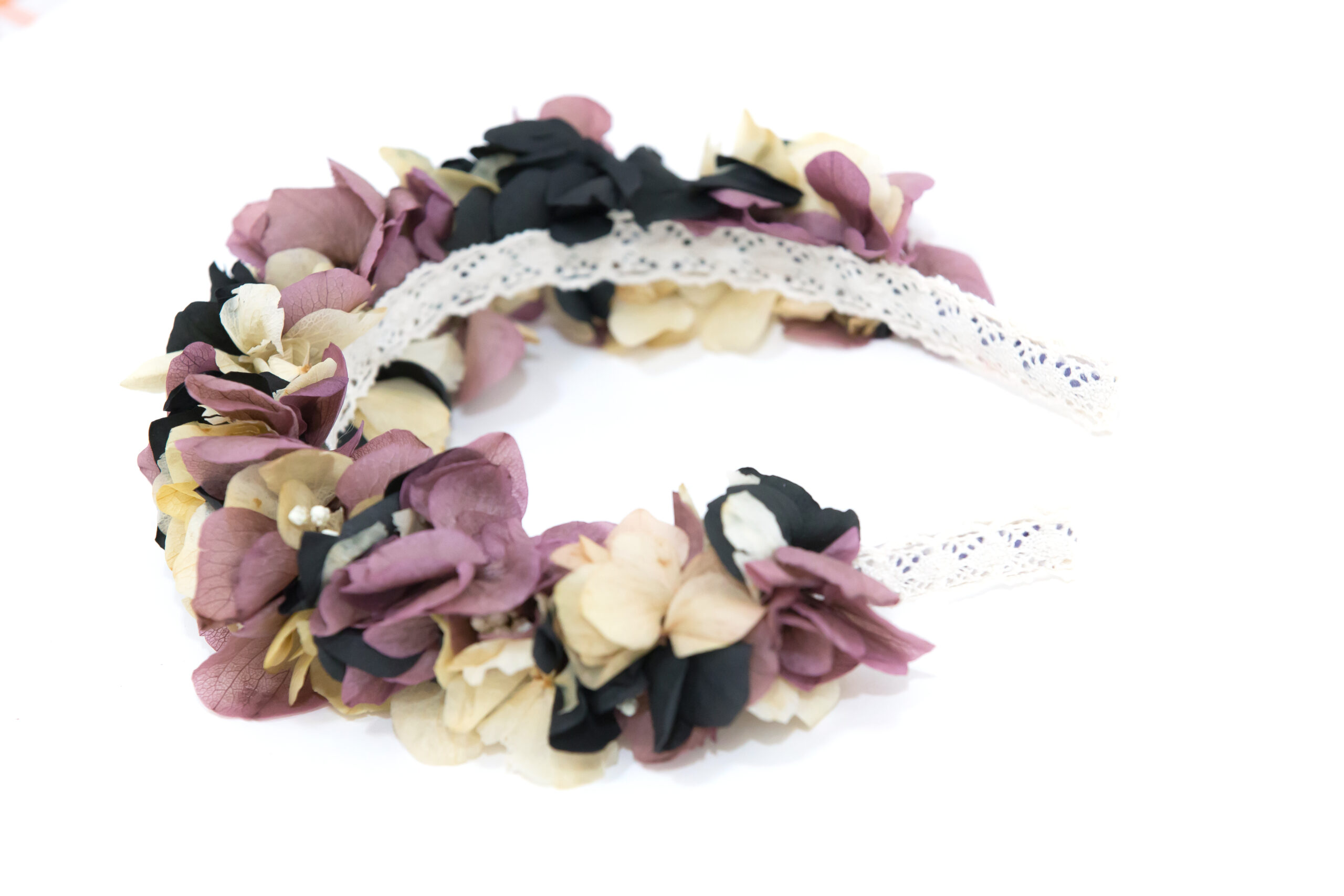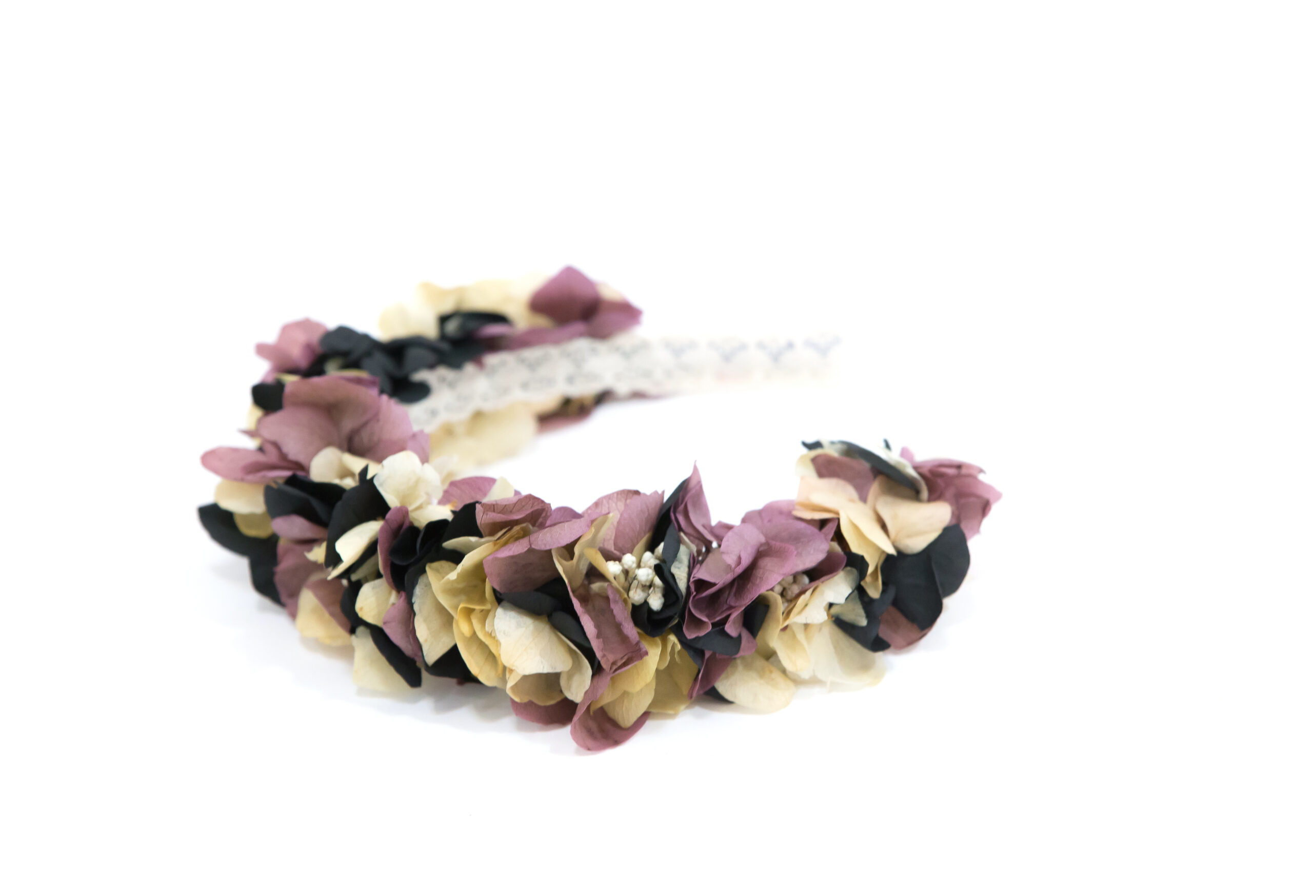 Diadema de flores preservadas en tonos negro, beige y rosa vintage. Hecha a mano, elegante y original. Favorecedora y perfecta para aportar un toque sobrio y bohemio a tu look, ¡además de ser comodísima y pegar con todo!