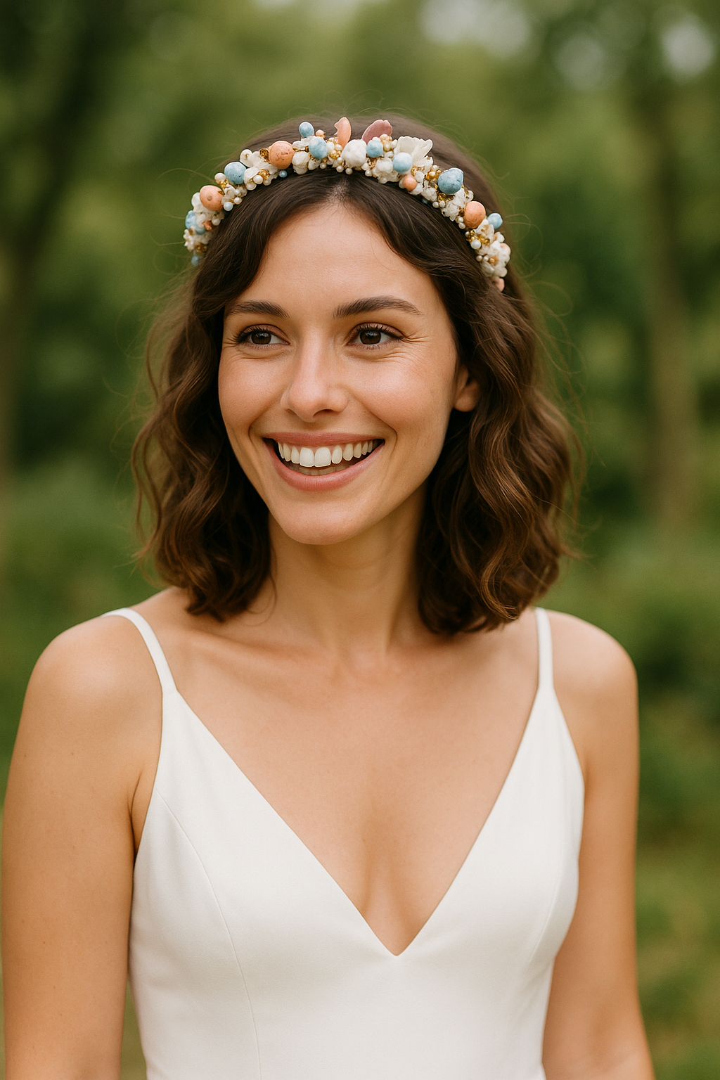 Diadema de cerámica a baja temperatura, pintada, esmaltada y engarzada manualmente de forma artesanal, en tonos azul, melocotón y blanco. Con hortensias blancas preservadas