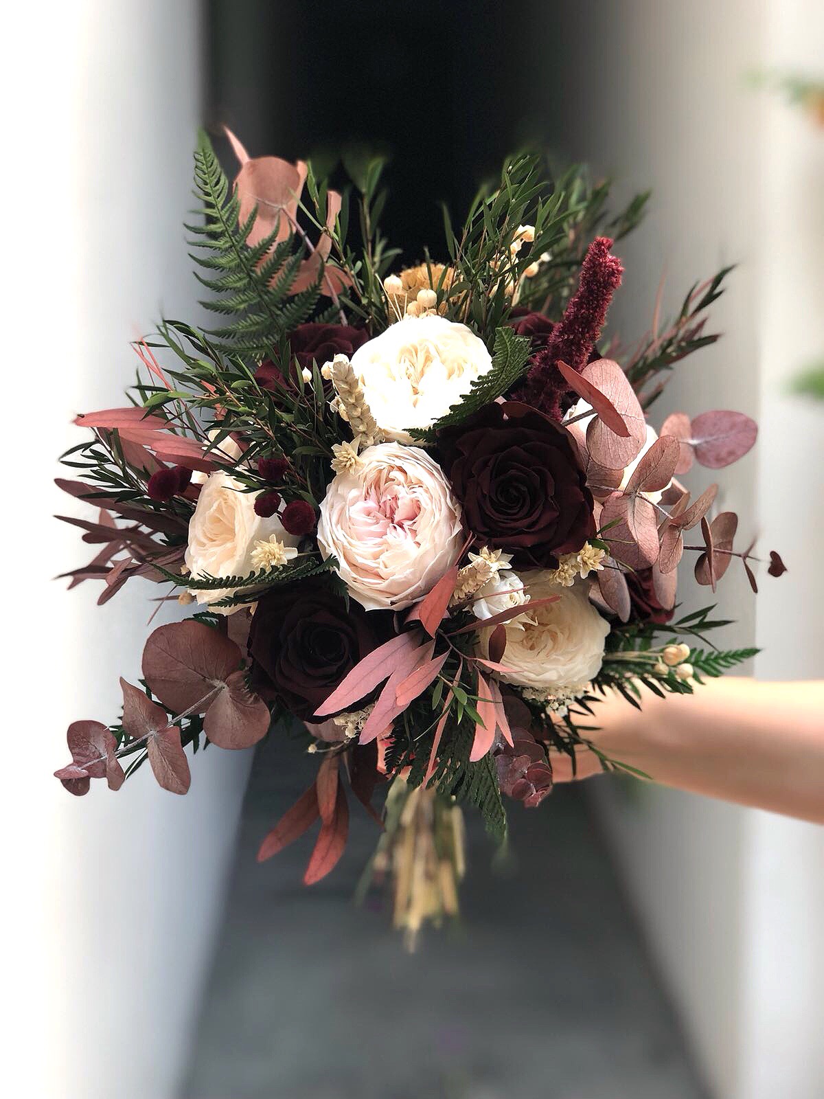 Si buscas un ramo con personalidad y una elegancia arrolladora, este es tu ramo. El ramo de flores preservadas Alice está elaborado con rosas inglesas en color nude, rosas aterciopeladas en color vino oscuro, eucalipto de dos tonos, helechos y otras pequeñas flores silvestres que hacen de él un ramo inigualable. Su tamaño es mediano, es ligero y fácil de llevar. Va atado con una cinta de terciopelo que podemos personalizar en cuanto a color.