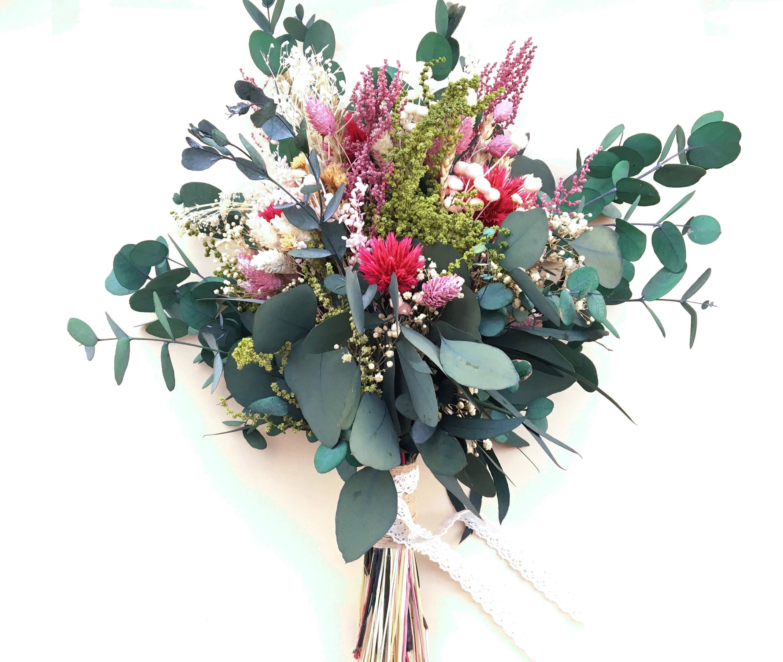 Chloe es un ramo de flores preservadas salvaje, divertido y original formado por distintos tipos de eucalipto preservado, cardos en tono rosa oscuro y una gran variedad de flores silvestres que le aportan un toque bohemio y desenfadado. Perfecto para looks de novia que huyen de lo clásico y convencional.