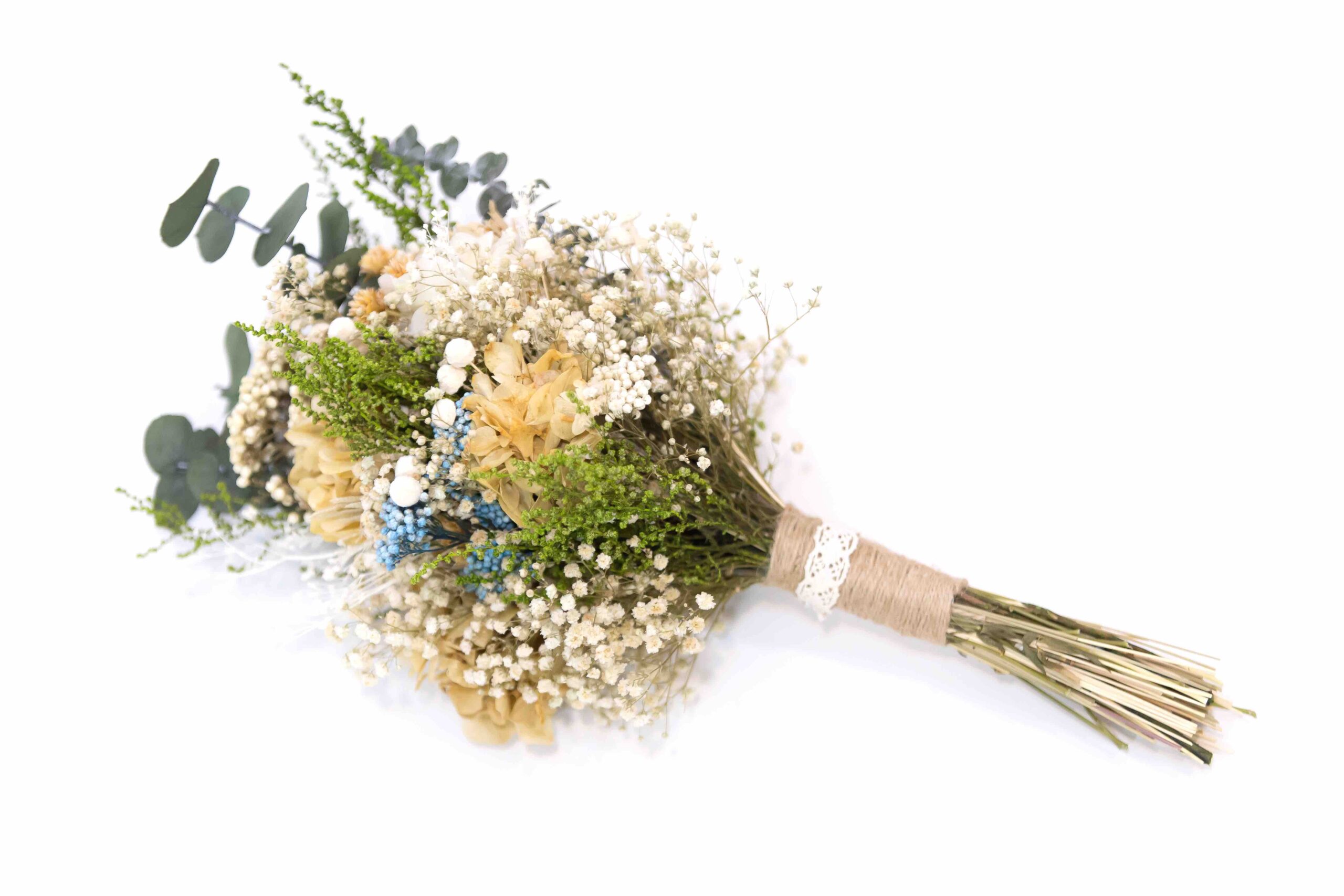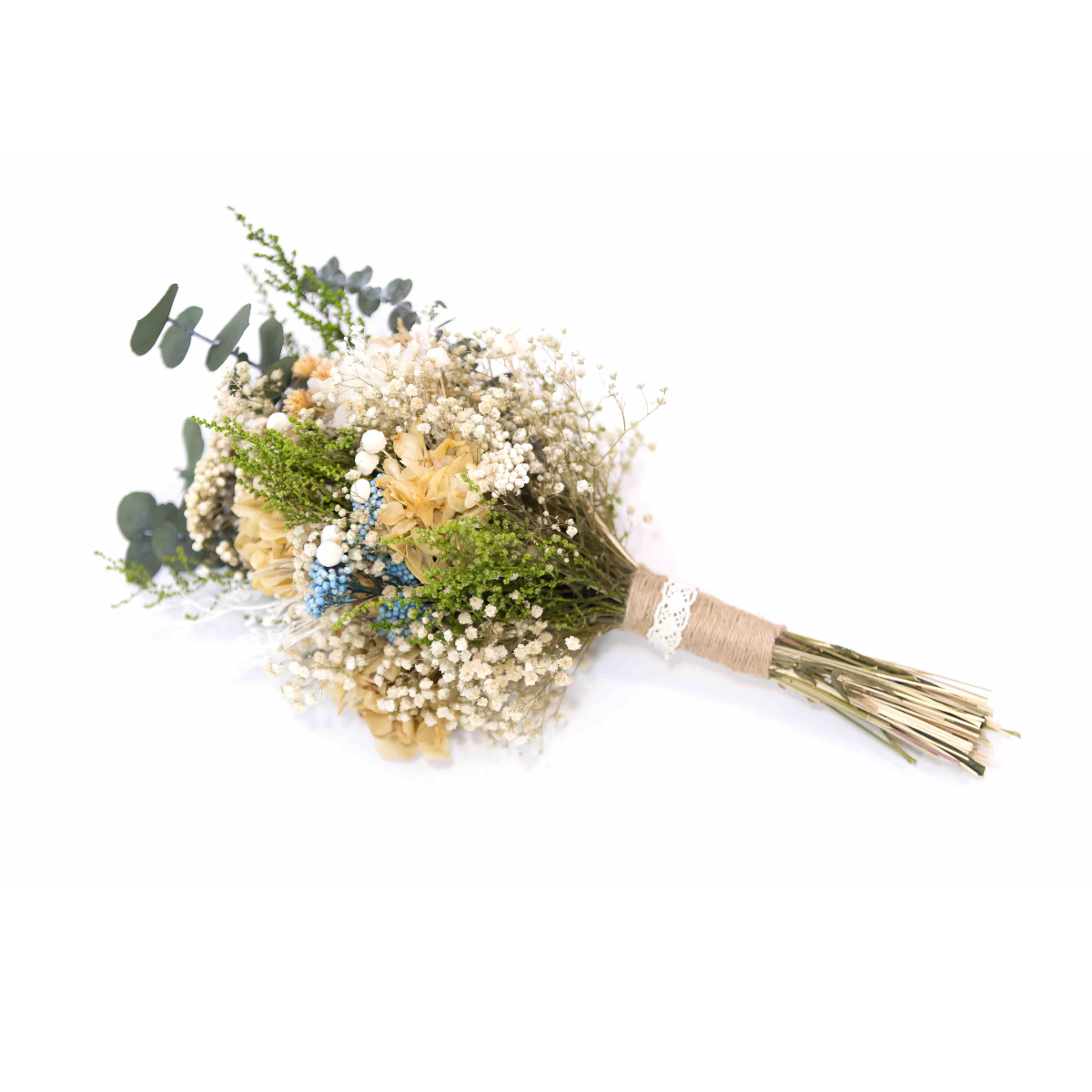 Ramo de flores preservadas silvestre y romántico, creado con distintos tipos de flores del campo. Contiene toques de flor de arroz en color azul, talla mediana. Es ligero, sencillo e ideal para novias de estilo boho que buscan un ramo que transmita romanticismo y un estilo rústico.