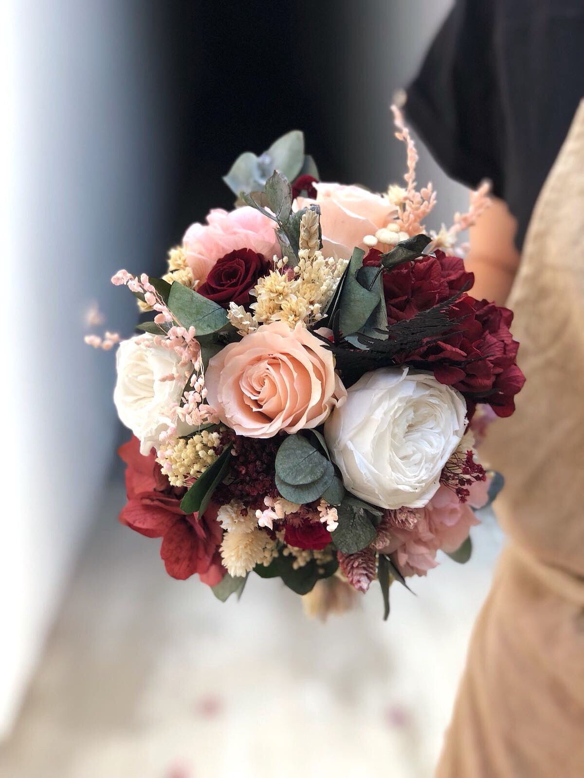 El bouquet CHIARA es especial por su variedad de flores (rosas, rosas inglesas, hortensia, eucalipto, flor silvestre), y sus tonos, que juegan entre los blancos y melocotón hasta los burdeos, que le dan un aspecto elegante y más sofisticado. Es un bouquet de tamaño mediano, comodísimo de llevar.
