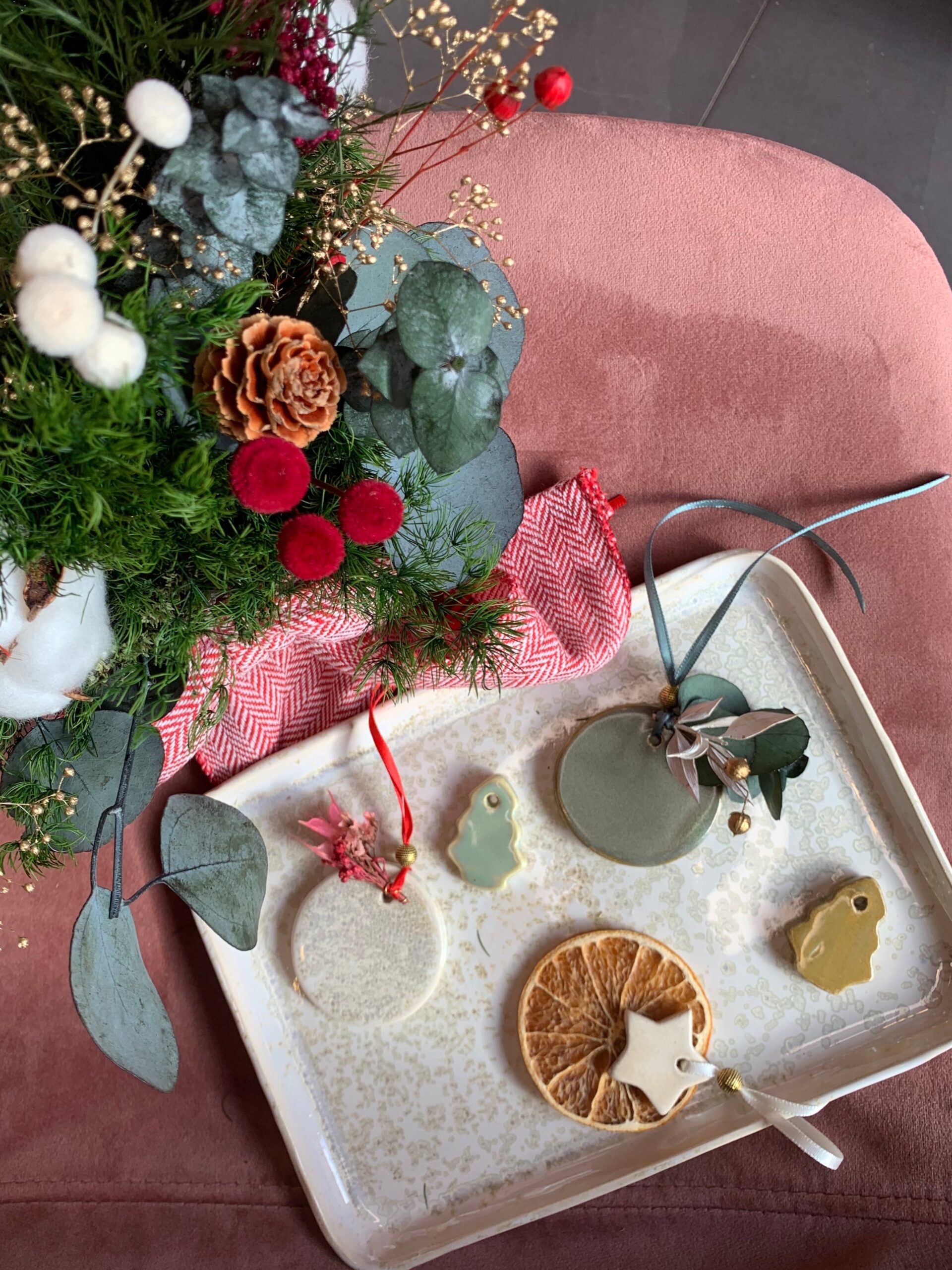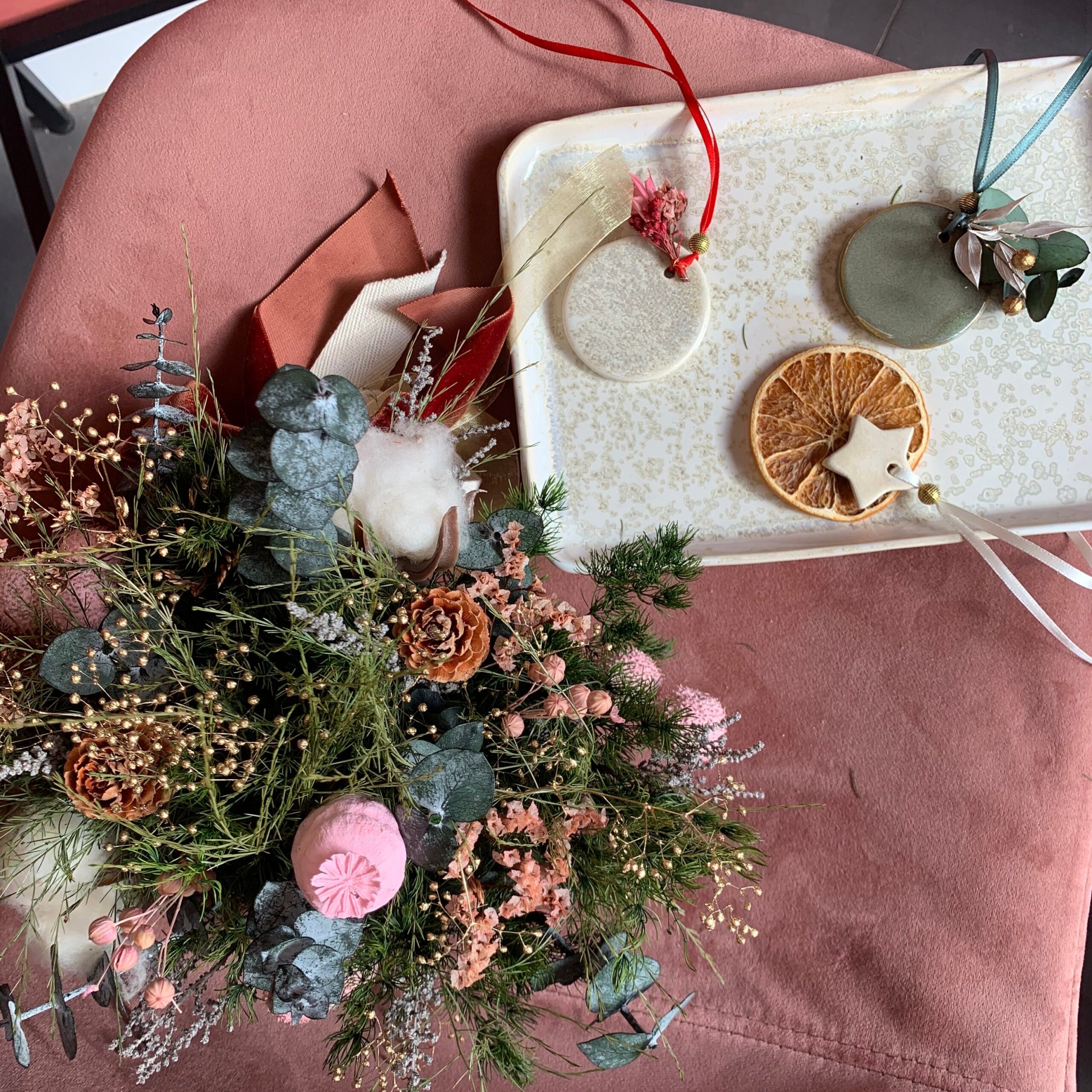 En este taller especial realizarás un centro o una corona navideño de flores y frutas preservas y crearás un adorno para el árbol de cerámica y flores preservadas.