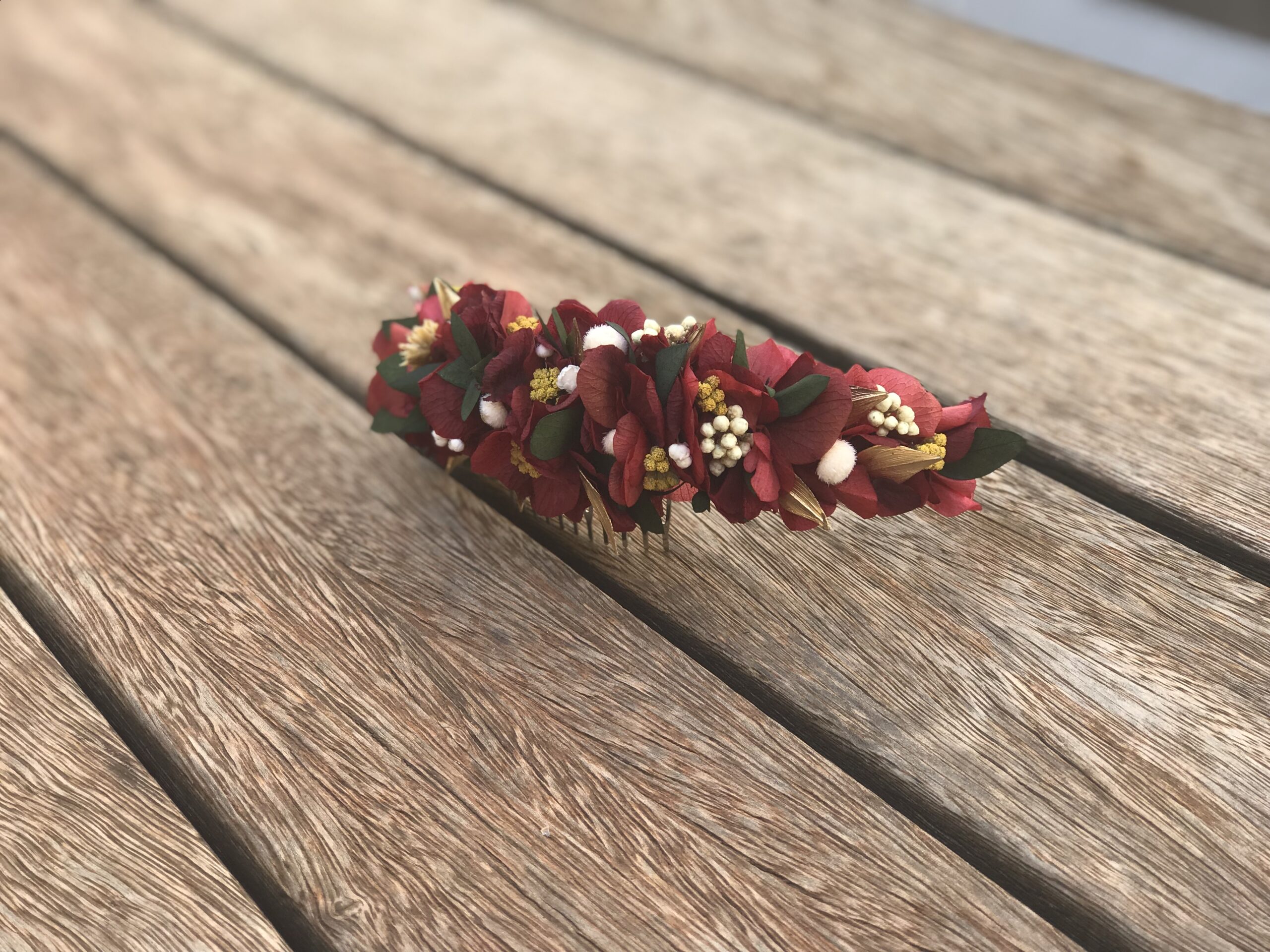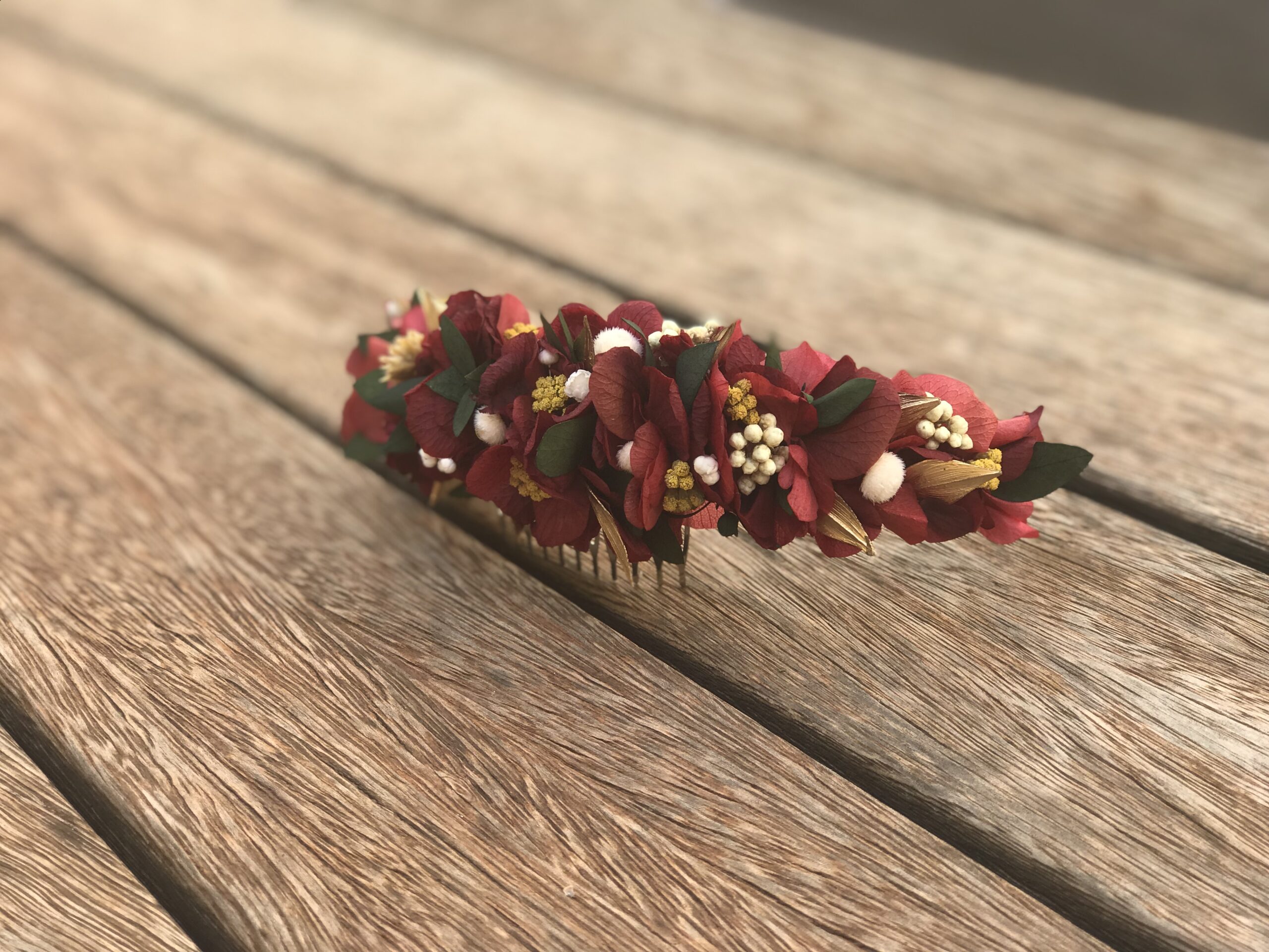 ¿Amante del burdeos? Sally es tu tocado. Está creado a mano con muchísimo amor en nuestro taller, utilizando flores preservadas de la mejor calidad. Es perfecto para complementar muchos tipos distintos de peinados: medio recogido, recogidos bajos, trenzas o pelo suelto